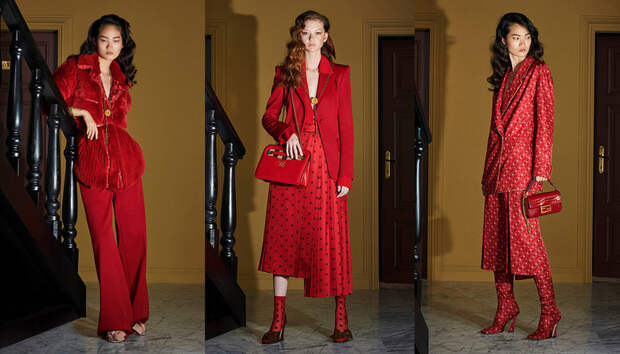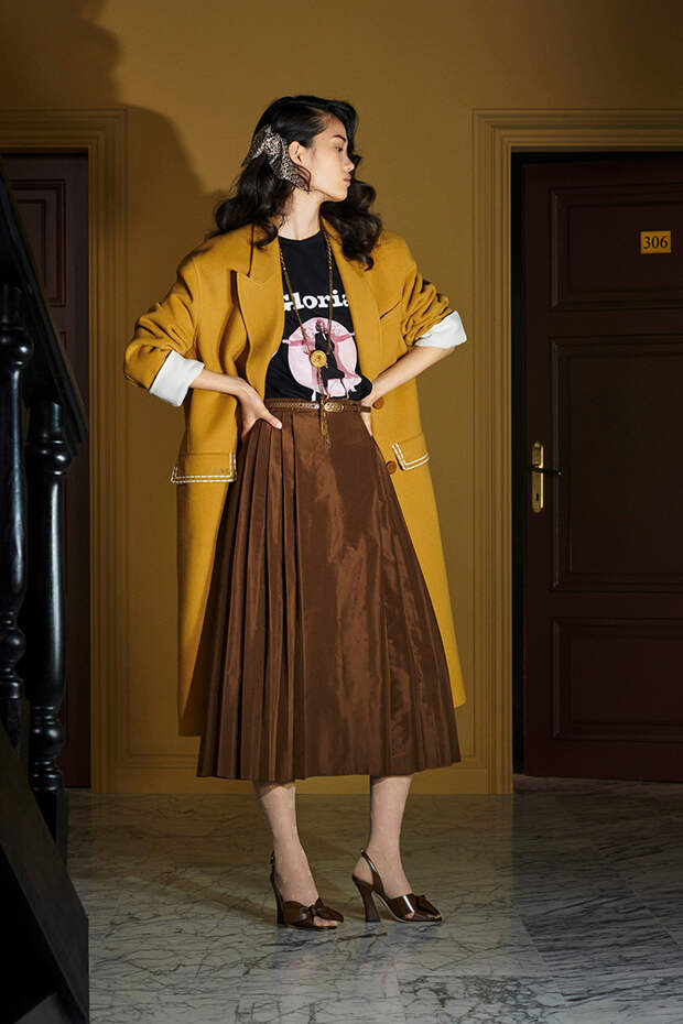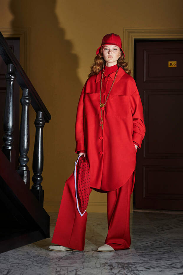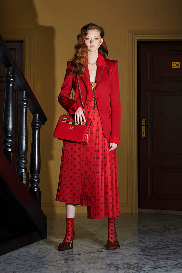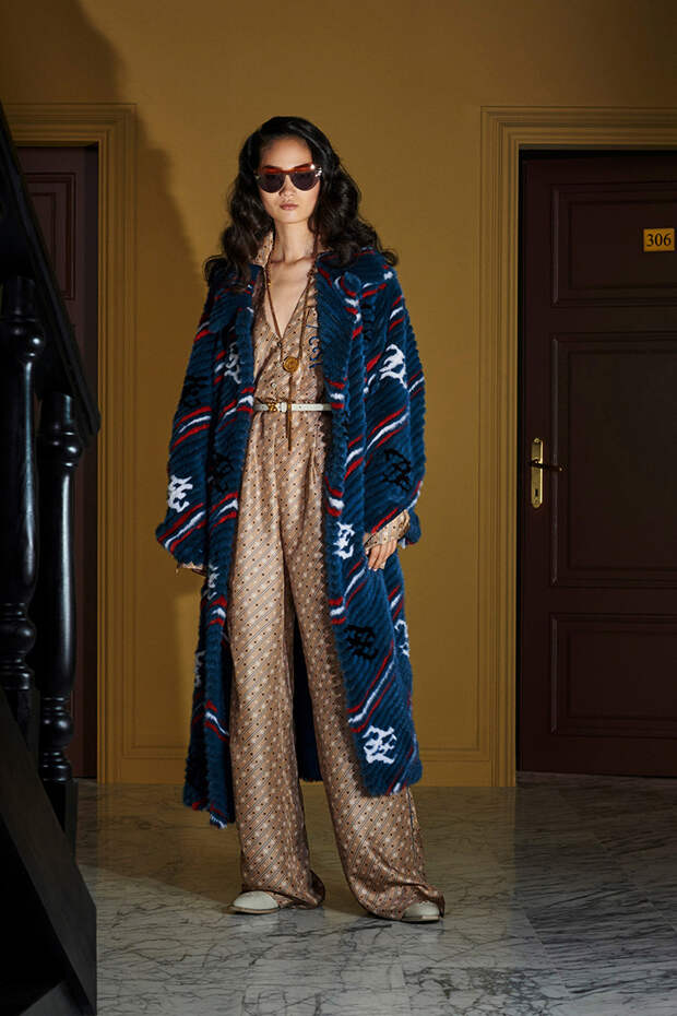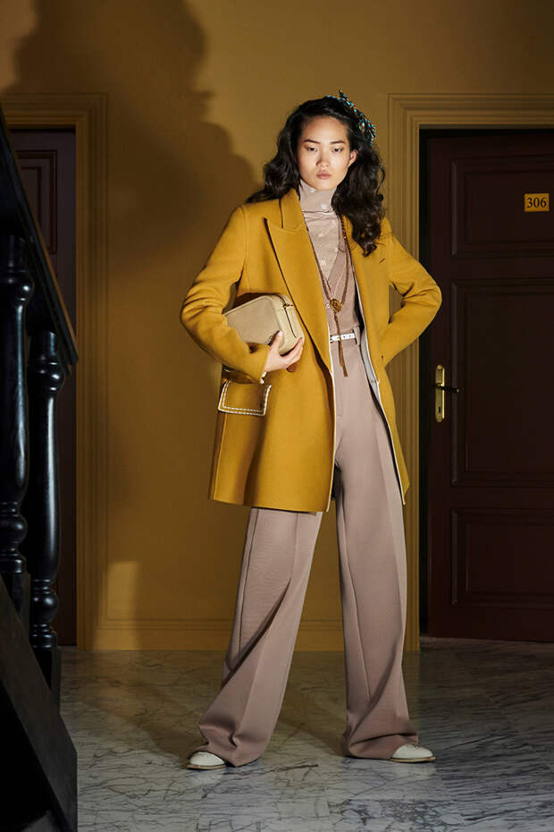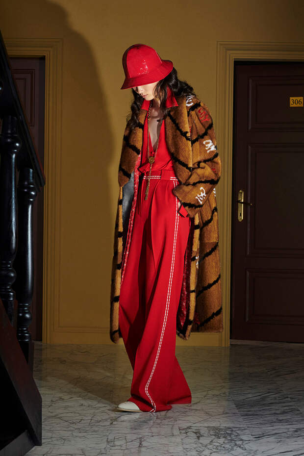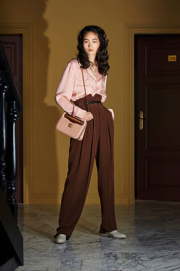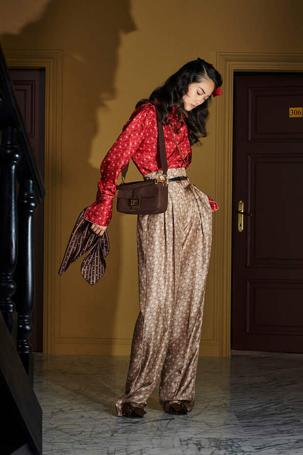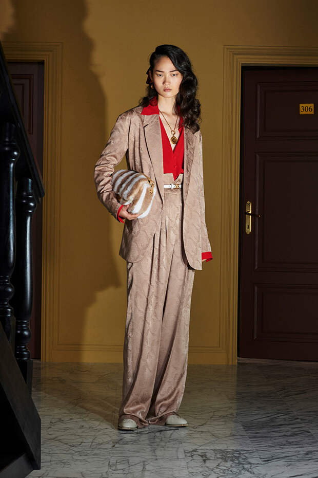 Это не Карл, но его влияние ощутимо. Женственность, самоирония и капля экстравагантности – получились невероятно женственные костюмы-двойки с широкими брюками и юбками плиссе, рубашка, отделанная мехом (однозначно звезда коллекции), а классические «статусные» Baguette и Peekaboo, как всегда, отлично уживаются с гольфами и девичьими босоножками с бантом.