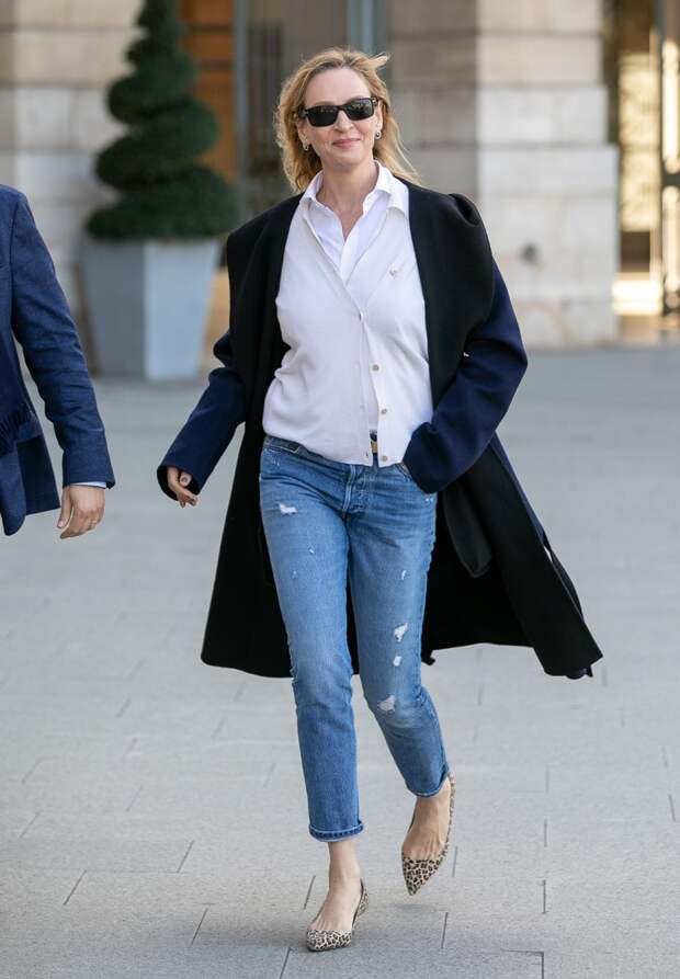 Вчера 48-летняя Турман покинула свой отель в расслабленном кэжуал-аутфите: прямых укороченных джинсах с потертостями, белой блузке, светлом кардигане и черно-синем пальто-халате. Но соль не зря кроется в деталях, и для нашей героини ярким акцентом стала обувь — лодочки с леопардовым принтом на каблуке-рюмочке, самом актуальном в этом сезоне. Отличный выбор, Ума!