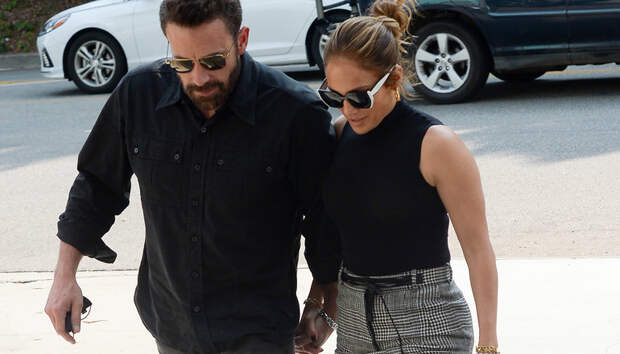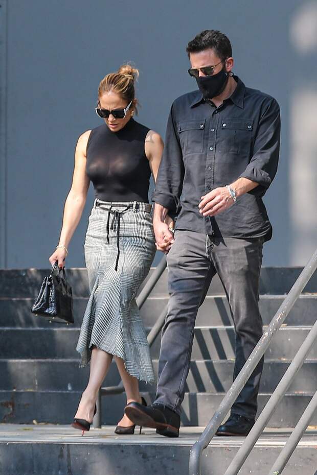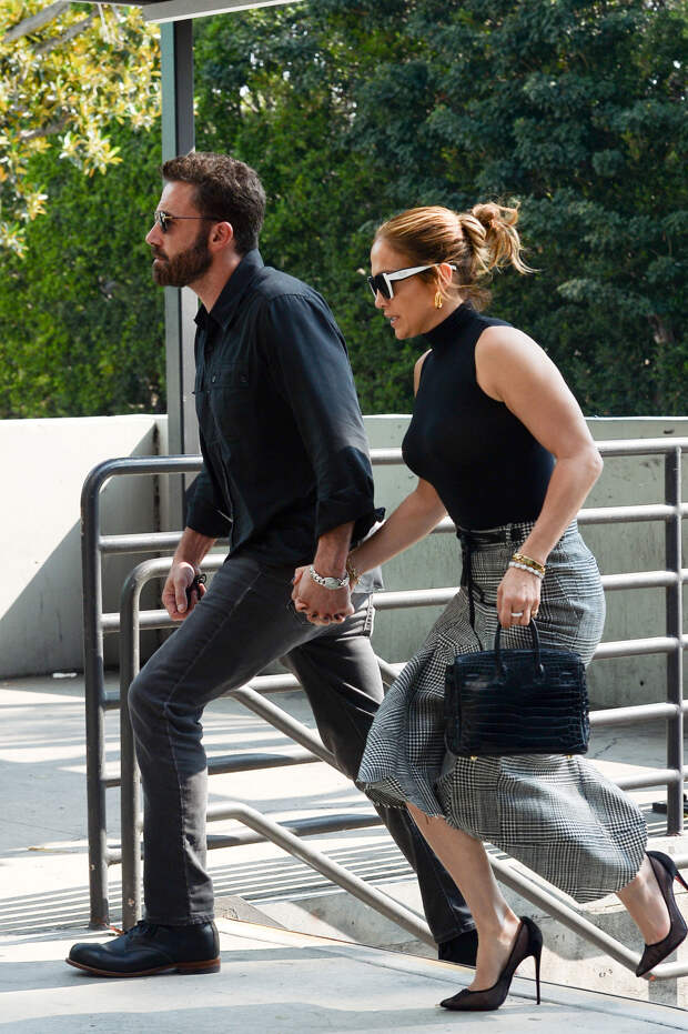 Возлюбленные решили действовать по формуле «черный верх — серый низ». Джей Ло выбрала строгую юбку-миди в клетку и простой черный топ без рукавов, которые дополнила лодочками на шпильке и небольшой сумочкой Hermes Birkin из крокодиловой кожи. Аффлек в целом выглядел чуть более расслабленно в своей черной рубашке навыпуск, серых джинсах и классических ботинках. И, конечно, оба надели темные солнцезащитные очки — но это, разумеется, не помогло им скрыться от прицелов вездесущих фотографов.