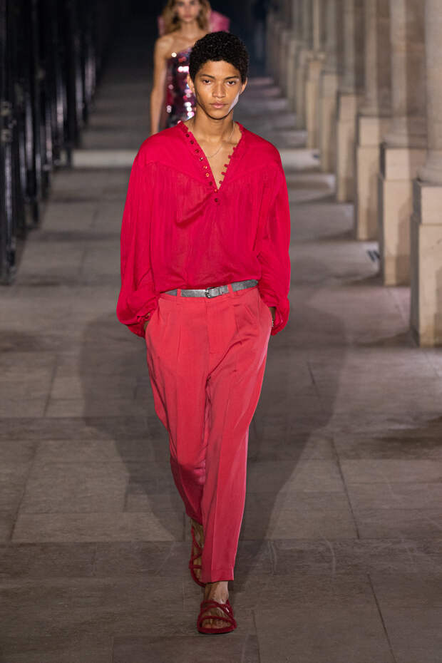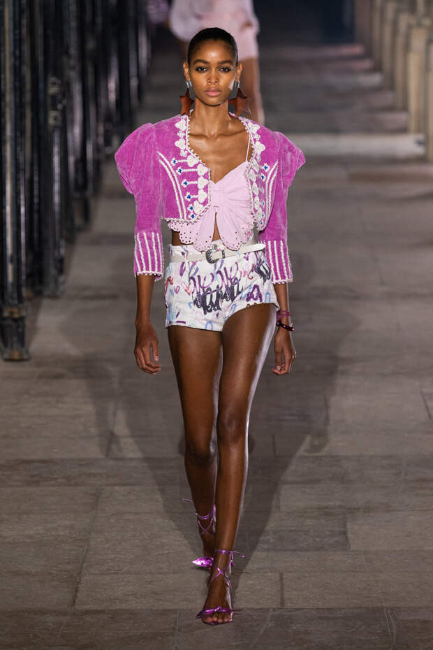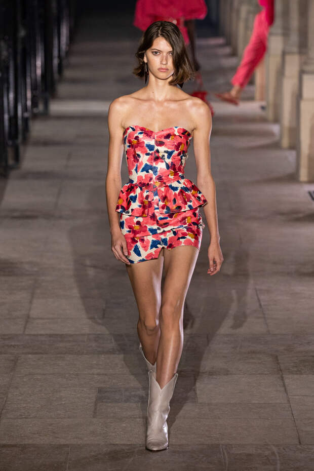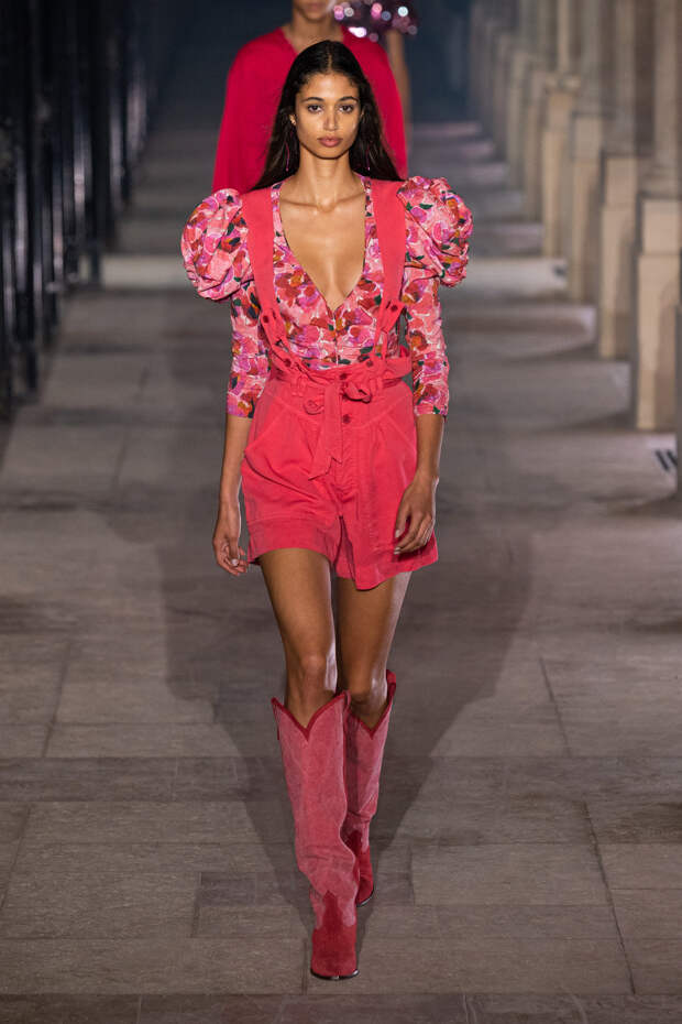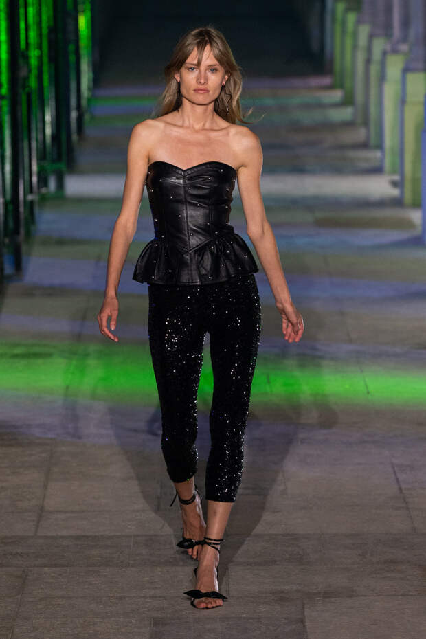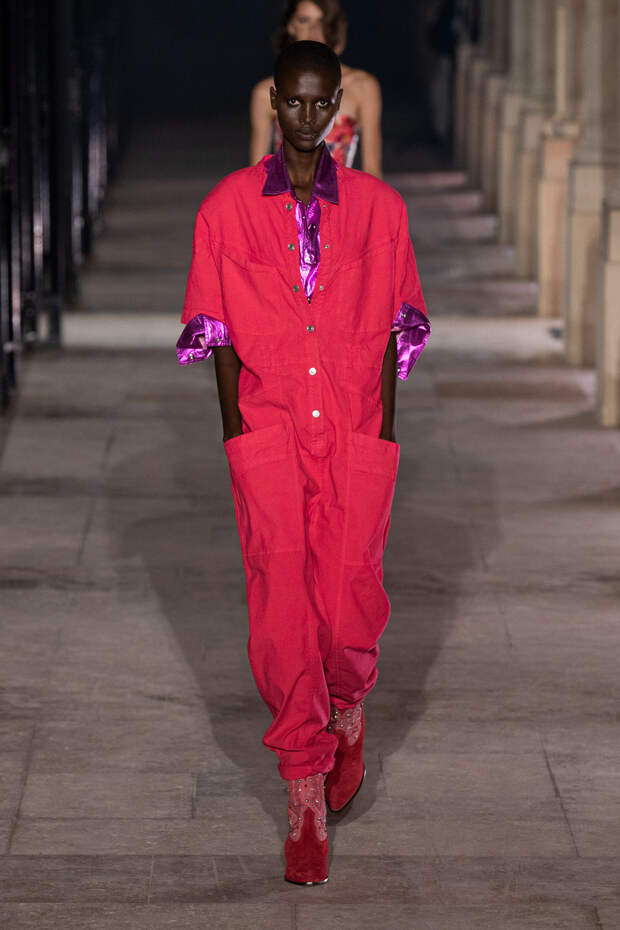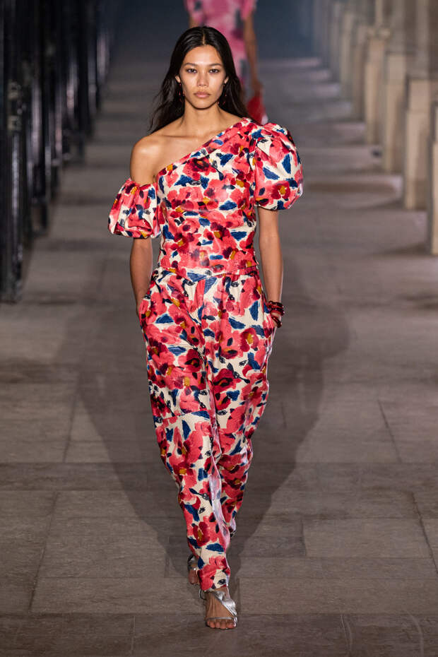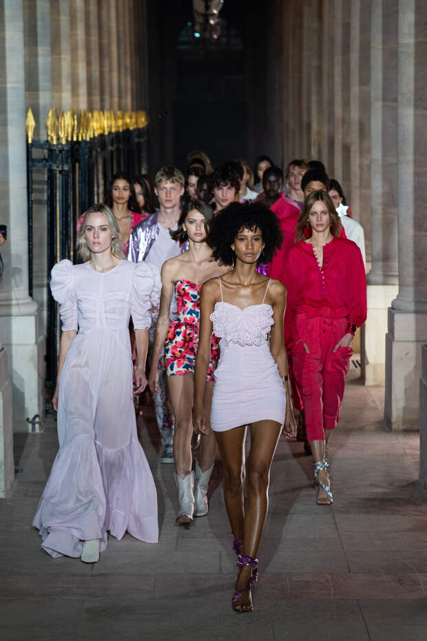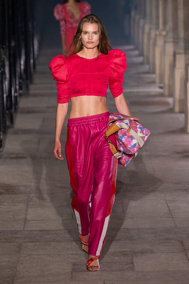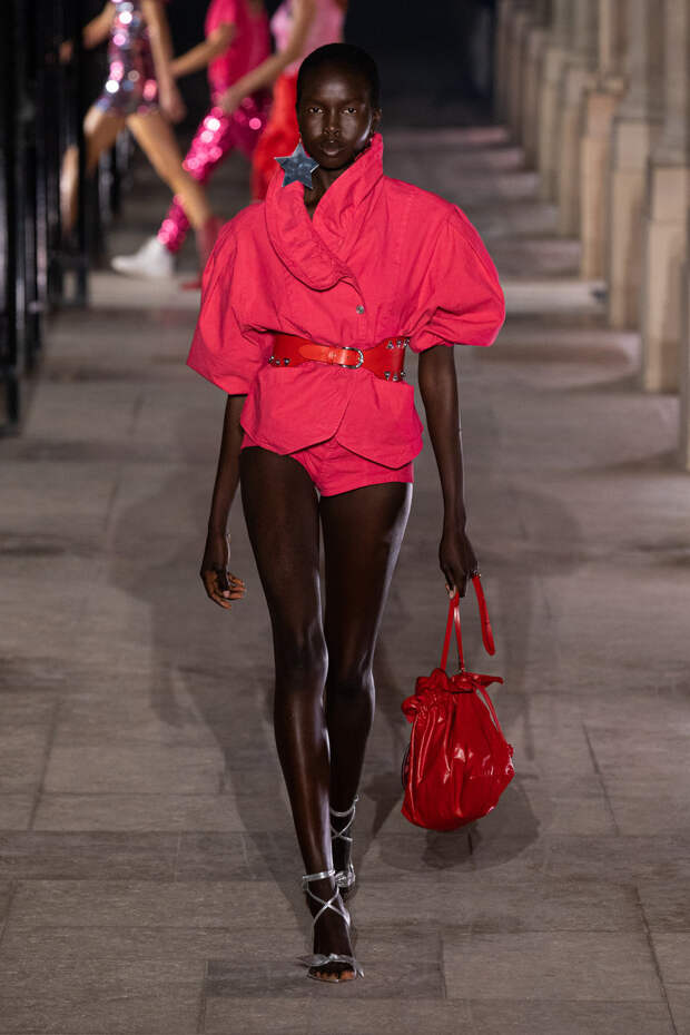 В самом начале показа можно было подумать, что идеальное название для этой коллекции — "жизнь в розовом цвете". Буквально: примерно треть луков выполнена целиком и полностью в розовом. Дизайнер решила открыть новый сезон, пожалуй, самым жизнерадостным цветом из существующих. Вышло крайне эффектно: розовыми были не только образы моделей, но и танцоров. Затем стали постепенно появляться всполохи красного, а там уже и целые выходы в белом, синем и черном. Коллекция оказалась поделена на примерно равные цветовые блоки из монохромных образов — кажется, это уже заметный тренд будущей весны. И, как по волшебству, вместе с цветами выходов моделей менялись и цвета одежды на танцорах. Общее настроение показа было довольно легкомысленным: игривые мини, декор в виде сердец и очень много блеска. Концептуальной эту коллекцию не назовешь, зато оптимизма в ней сполна — а он необходим нам, как никогда. В плане силуэта велосипед Маран не изобрела: вся коллекция в очередной раз построена вокруг ее любимых восьмидесятнических линий с широкими острыми плечами и акцентированной завышенной талией.
