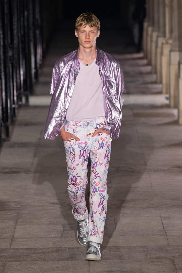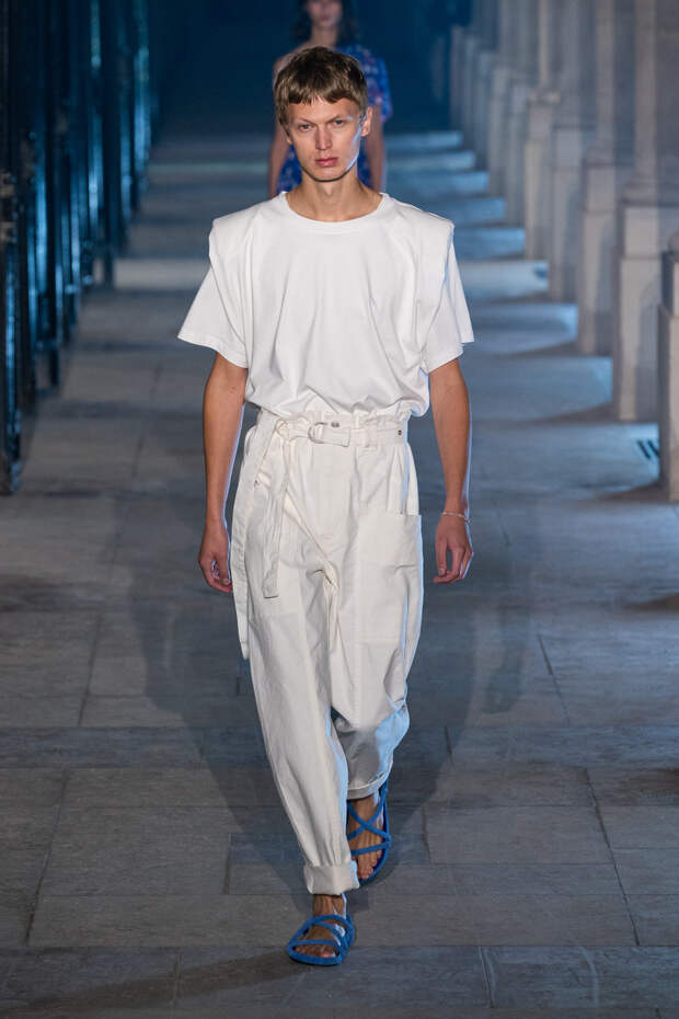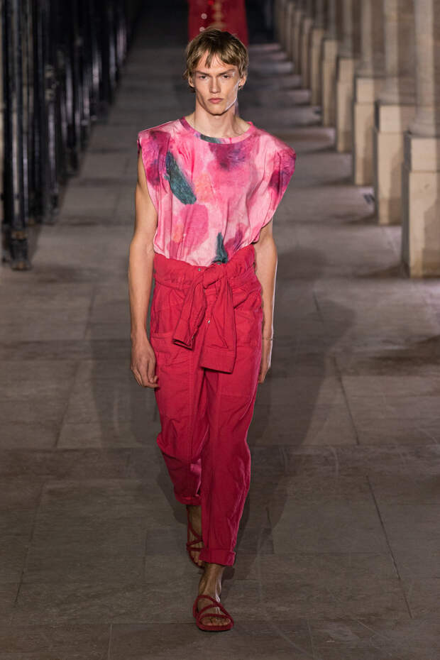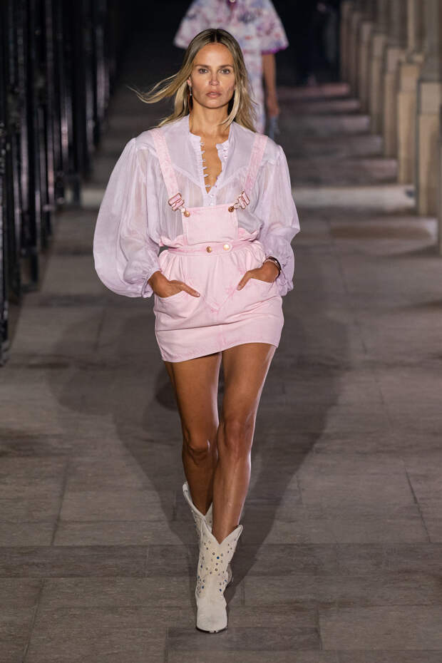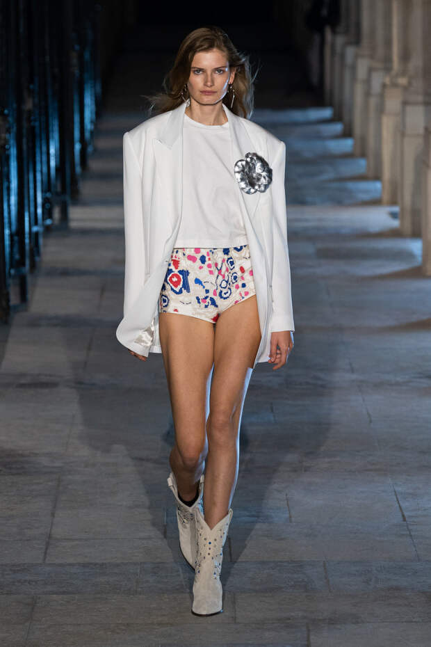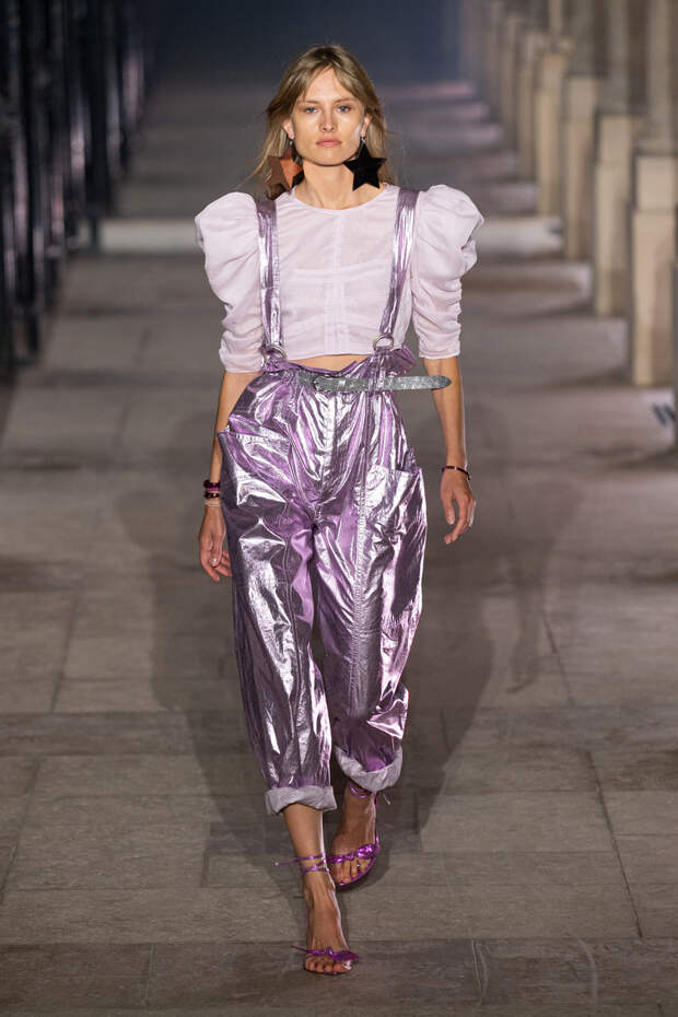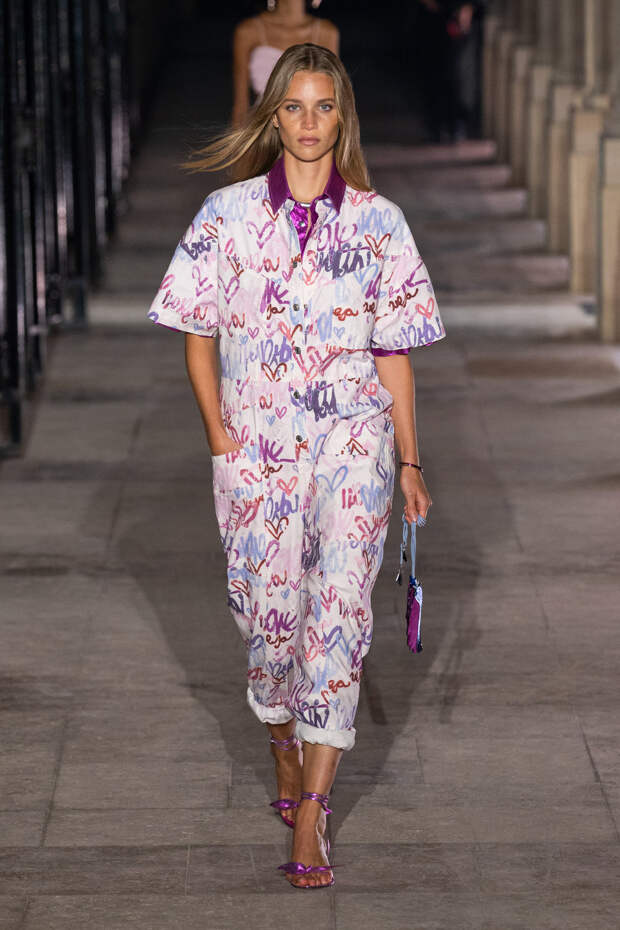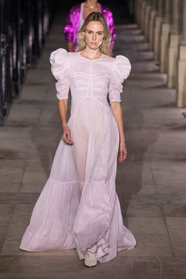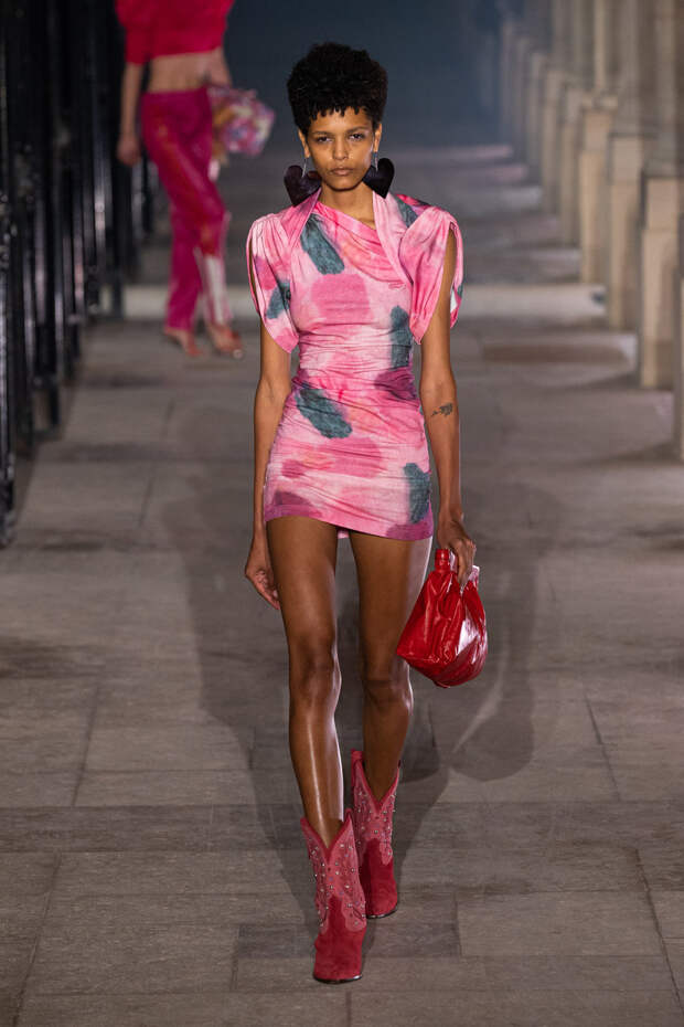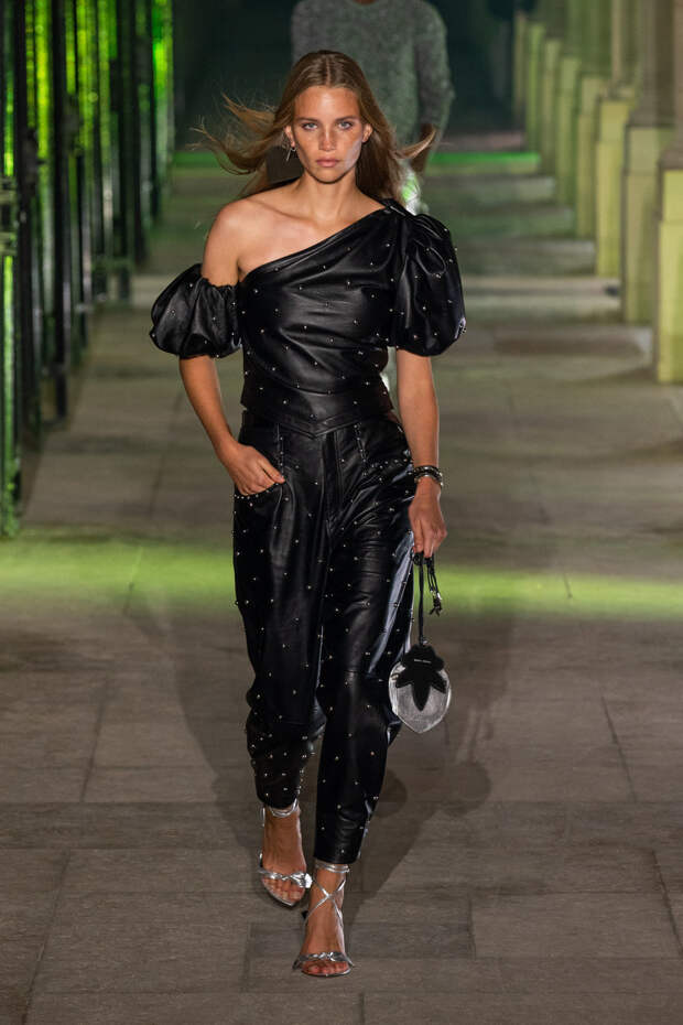В самом начале показа можно было подумать, что идеальное название для этой коллекции — "жизнь в розовом цвете". Буквально: примерно треть луков выполнена целиком и полностью в розовом. Дизайнер решила открыть новый сезон, пожалуй, самым жизнерадостным цветом из существующих. Вышло крайне эффектно: розовыми были не только образы моделей, но и танцоров. Затем стали постепенно появляться всполохи красного, а там уже и целые выходы в белом, синем и черном. Коллекция оказалась поделена на примерно равные цветовые блоки из монохромных образов — кажется, это уже заметный тренд будущей весны. И, как по волшебству, вместе с цветами выходов моделей менялись и цвета одежды на танцорах. Общее настроение показа было довольно легкомысленным: игривые мини, декор в виде сердец и очень много блеска. Концептуальной эту коллекцию не назовешь, зато оптимизма в ней сполна — а он необходим нам, как никогда. В плане силуэта велосипед Маран не изобрела: вся коллекция в очередной раз построена вокруг ее любимых восьмидесятнических линий с широкими острыми плечами и акцентированной завышенной талией.